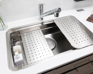 シンクの中段にプレートが設置でき、使いやすさが大幅にアップしました。水切プレート2枚と洗剤バスケット付です。また、静音シンクも採用しています。