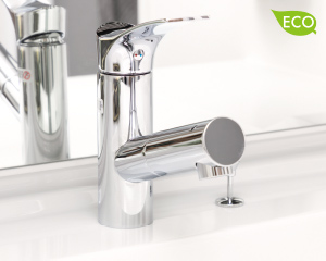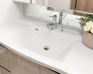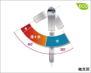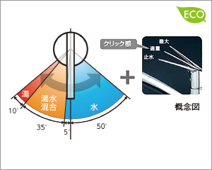 レバー中央まで水が出るエコ水栓を採用。湯水混合への切替時にクリック感があり、水と湯をしっかり使い分けます。無意識のうちに節湯ができるので、エネルギーのムダ使いを軽減できます。