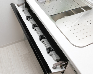 シンク手前に装備し、包丁の出し入れを容易にしました。チャイルドロック付なので、小さなお子さまがいるご家庭にも安心です。