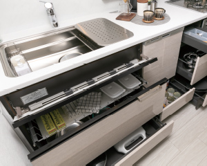 多くの食器を効率良く洗え、省エネ・節水効果にも優れた食器洗浄乾燥機。使いやすいビルトインの引き出しタイプです。
