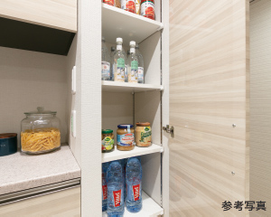 キッチンには、使い勝手のよい食品庫をご用意。まとめ買いの食品や缶詰、調味料などの収納に活躍します。