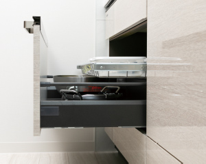 キッチンと食器棚の引き出しは、閉まるときの衝撃をやわらげる機能をそなえたソフトクローズを採用。やさしく静かな使い心地です。