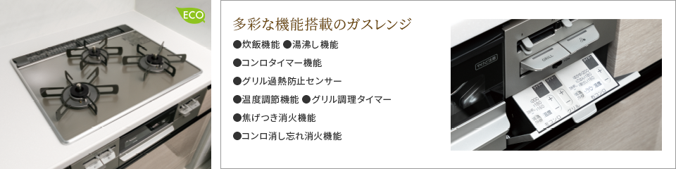 多彩な調理機能がうれしい強火力&高効率タイプで、魚焼きグリルは、水無し両面焼きのものを採用。また、ガラストップなのでお手入れしやすいです。