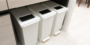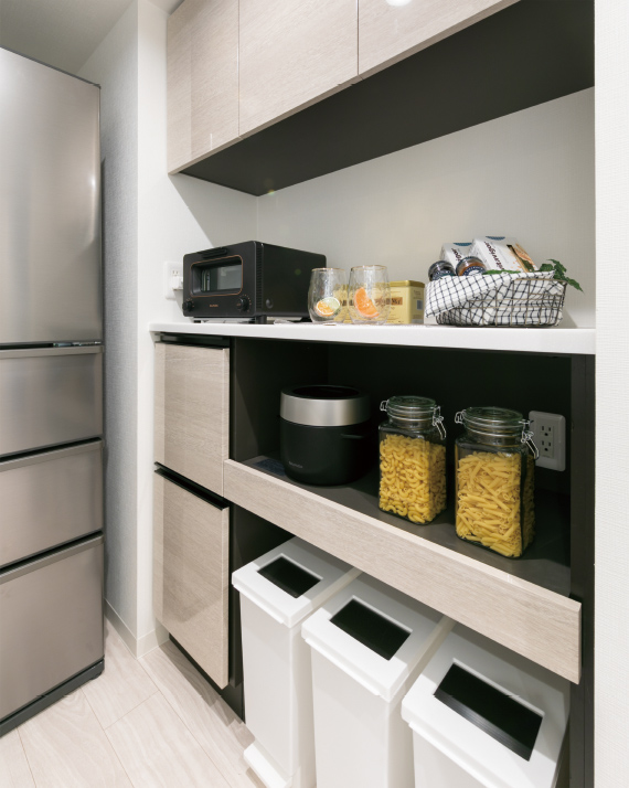 食器棚のカウンター下を、ゴミ箱スペースとして有効利用。ゴミ箱で空間をムダにすることがありません。