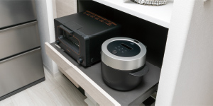 調理家電などのアイテムも楽に収納して出し入れできる、スライド式のカウンターをご用意しています。