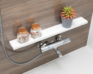 小物などを置くのに便利なスリムカウンターを設置。簡単に取り外しが可能で、汚れやすくお手入れの面倒な部分もきれいに洗えます。