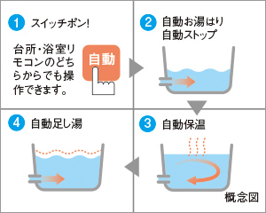 浴槽のお湯はりから保温まで、スイッチひとつですべて自動操作。経済的な追い焚き機能付だから、いつでも気軽に入浴できます。