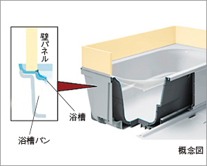 浴槽の上に壁パネルを載せるフレーム分割構造。カビや悪臭などの原因となる浴槽の裏側に水が入りにくい構造になっています。