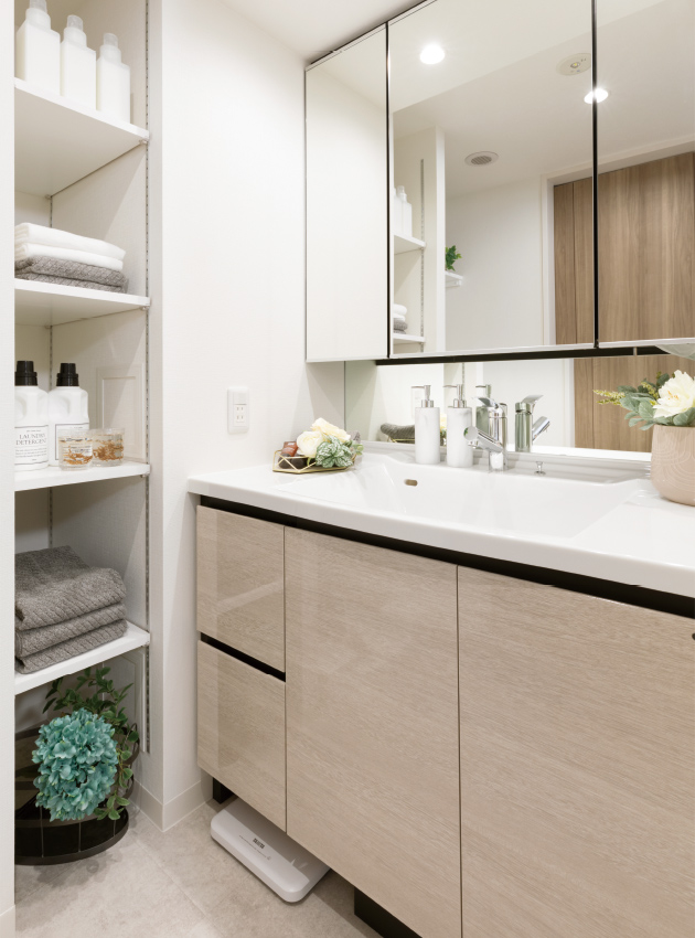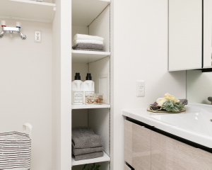 タオルや洗剤、洗濯用品などをストックしておけるリネン棚を設置。なにかと煩雑になりやすい小物の整理に重宝します。※タイプにより仕様が異なります。