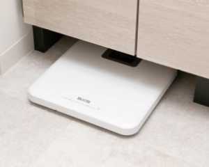 洗面化粧台の下部に、普段置き場に困るヘルスメーターの収納スペースを確保。必要なとき、サッと取り出して使えます。