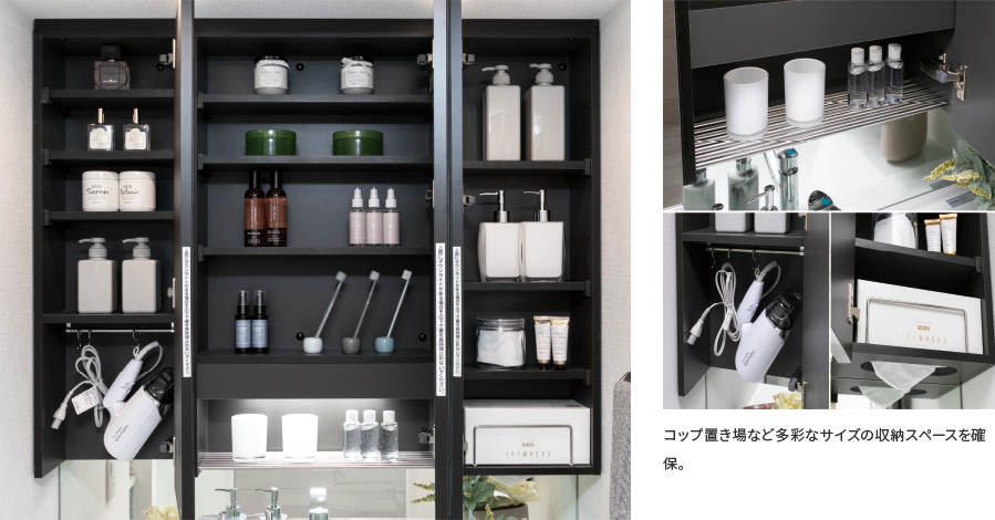 三面鏡の裏側は、化粧品や小物など、必要なものがきれいに収まります。