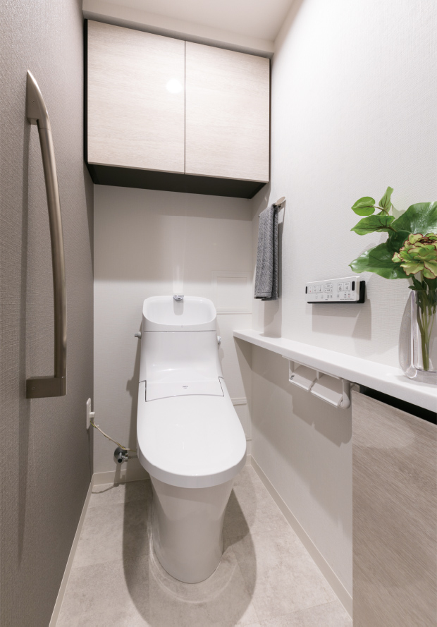 トイレットペーパー等のトイレ用品も目にふれないように収納ができる大型の吊戸棚を設置しています。