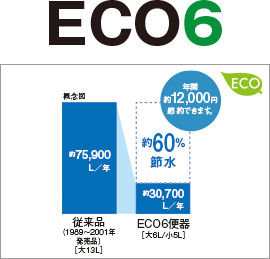 大洗浄6L、小洗浄4.5Lの「超節水ECO6トイレ」。従来品(大13L)※と比べ約60%の節水を実現しました。