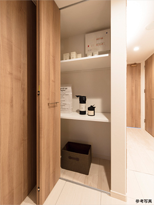 ホール・廊下には、毎日のお掃除道具から普段使わない季節用品などを、すっきり整頓できる物入を設けています。※B・Dタイプのみ。