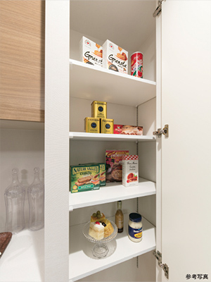 キッチンには、使い勝手のよい食品庫をご用意。まとめ買いの食品や缶詰、調味料などの収納に活躍します。※Dタイプを除く。