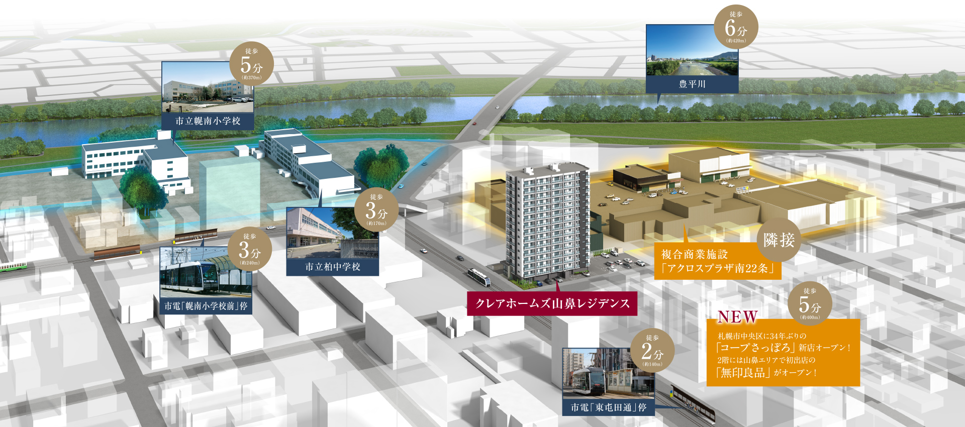 商業・教育・自然や交通アクセスといった、快適な暮らしを構成する要素が徒歩圏内にすべて揃う、山鼻の新たな暮らしの中心地へ。