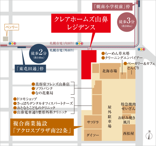 (北海市場 山鼻店/ベーカリー&カフェ どんぐり/風月山鼻店/特急焼肉せいざん/らーめん草木塔/サツドラ/西松屋/ダイソー) - 徒歩2分(約150m)